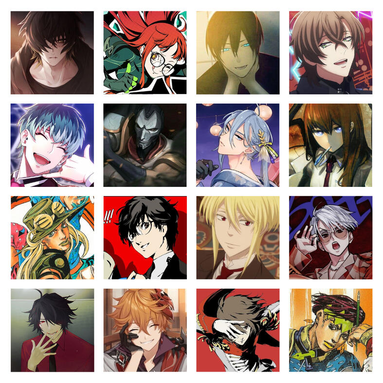 towa, futaba, kawase, gentaro yumeno, sasara nurude, khada jhin, edmond, makise kurisu, gyro zeppeli, akira kurusu, william james moriarty, rikai kusanagi, shinbashi, childe, goro akechi, rohan kishibe
